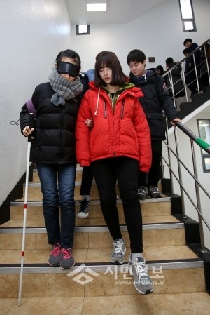 지난 20일 겨울방학을 맞아 송파구민회관에서 열린 '장애체험 프로그램'에 참가한 청소년들이 서로 짝을 이뤄 서로를 의지하며 계단을 내려가는 시각장애인 보행 체험을 하고 있다.(사진제공=송파구청)
