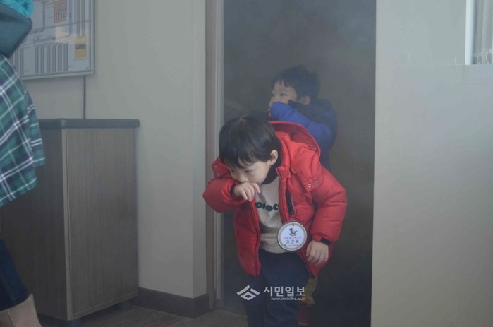 인천 남동소방서가 21일 본청사 119소방안전체험장에서 '킨더가든 어린이집' 원생을 대상으로 소방안전체험교실을 운영했다. 체험교육은 화재시 피난 체험, 화재예방 영상시청, 소방차량 관람하기 등으로 진행됐다. 사진은 교육에 참여한 어린이들이 연기체험실에서 피난 체험을 하는 모습. (사진제공=남동소방서)