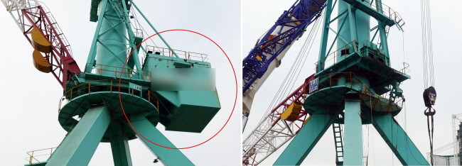 21일 오전 9시 46분께 부산 영도구 청학동 모 조선소에서 선박건조용 40t급 지브크레인의 무게 중심을 잡는 평형추(윈치) 부분이 12m 아래로 추락했다.