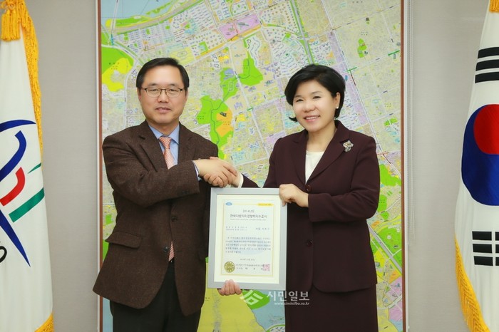 서울 서초구가 지난 21일 한국공공자치연구원의 지방자치단체 대상 평가에서 '한국지방자치경쟁력지수 종합경쟁력 최우수기관'으로 선정됐다. 사진은 조은희 구청장이 이기헌 한국공공자치연구원 대표이사로부터 최우수기관 인증서를 받는 모습. (사진제공=서초구청)