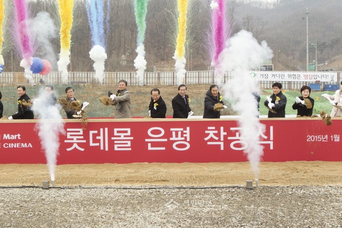 22일 서울 은평구 진관동 79-15번지의 롯데몰 은평 신축부지에서 오는 2016년 12월 준공예정인 '롯데몰 은평 착공식'에 참가한 관계자들과 김우영 구청장(왼쪽 네번째)이 첫 삽을 뜨고 있다.(사진제공=은평구청)