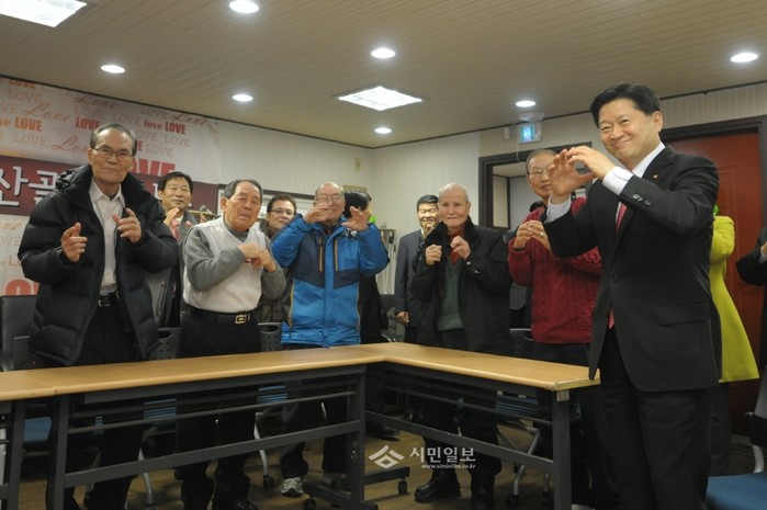 서울 최창식 중구청장은 지난 21일 오후 4시 명동 남산센터에서 열린 '명동 주민인사회'에 참석해 수화 등을 배우며 장애인 체험을 가졌다. 사진은 최 구청장이 주민들과 함께 수화를 배우고 있는 모습. (사진제공=중구청)