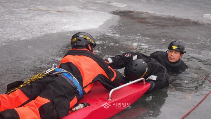 경기 군포소방서가 최근 혹한기 수난사고시 특수한 수중환경에서 기술향상과 전문수난구조대원 양성을 위해 '동계수난구조훈련'을 실시한 가운데 훈련에 참가한 구조대원들이 수상장비를 활용해 요구조자를 구출하고 있다. (사진제공=군포소방서)