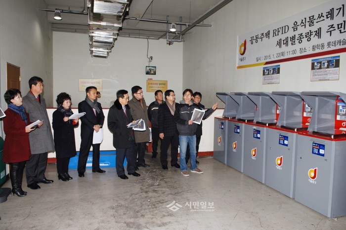 최근 서울 중구 황학동 롯데캐슬 베네치아 아파트에서 열린 '공동주택 RFID방식 음식물 쓰레기 세대별 종량제 주민설명회'에 참석한 서울 중구의회 복지건설위원회 소속 의원들이 관계자로부터 설명을 듣고 있다.(사진제공=중구의회)