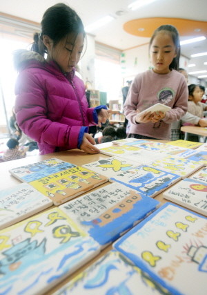 '세월호, 기억의 벽, 타일 그리기' 행사가 23일 오후 대전 유성구 모퉁이도서관에서 열린 가운데 어린이들이 타일에 그림을 그리고 있다.