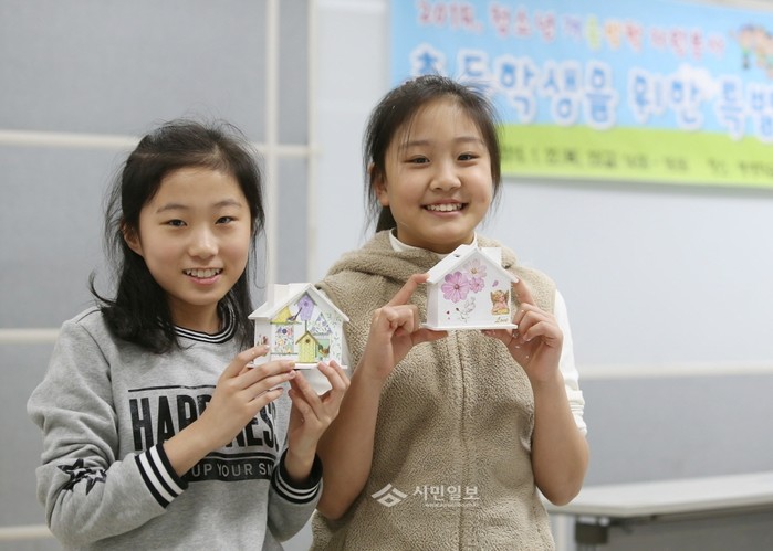 최근 서울 금천구가 구청 평생학습관에서 '꿈나무 자원봉사 리더 겨울방학 자원봉사 프로그램' 중 하나인 '냅킨아트를 활용한 저금통 만들기' 프로그램을 초등학생 30명을 대상으로 실시했다. 참여자들은 이 저금통에 용돈을 모아 불우이웃을 돕는 데 기부할 예정이다. 사진은 만든 저금통을 들어보이는 아이들의 모습.(사진제공=금천구청)