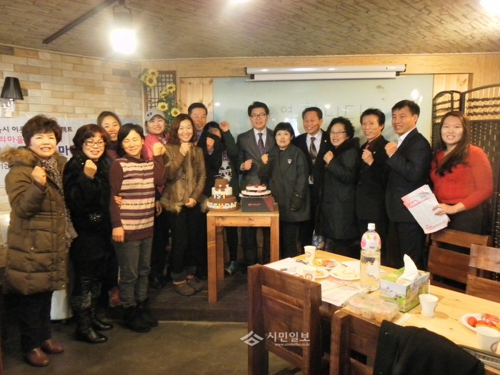 최근 성동구 용답동의 마을공동체 '행복공감'이 개소 1주년을 맞아 기념행사를 가졌다. 행복공감은 마을 관련 일을 주민이 결정하고 추진하는 주민자체 공동체다. 사진은 이날 행사에 참여한 정원오 성동구청장(가운데)과 이은주 행복공감 소장, 지역 주민들이 기념촬영한 모습.(사진제공=성동구청)