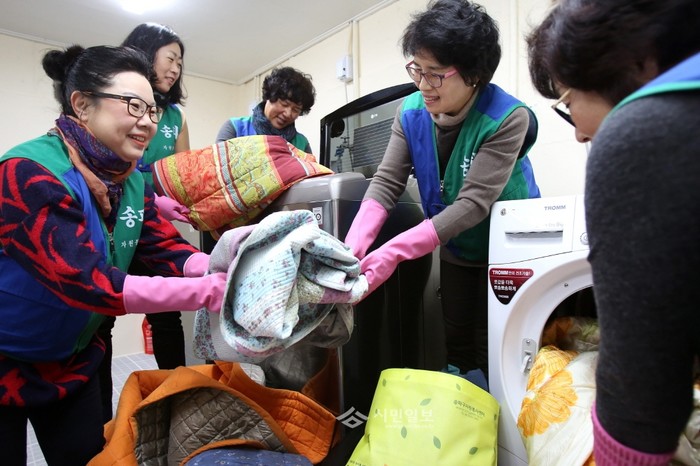 최근 홀몸노인과 중증 장애인의 세탁을 위해 서울 송파구 풍납1동 동아한가람아파트 지하에 마련된 '사랑의 빨래터'에서 송파구 자원봉사센터 봉사자들이 수거한 이불들을 정리해 세탁기에 넣고있다.(사진제공=송파구청)