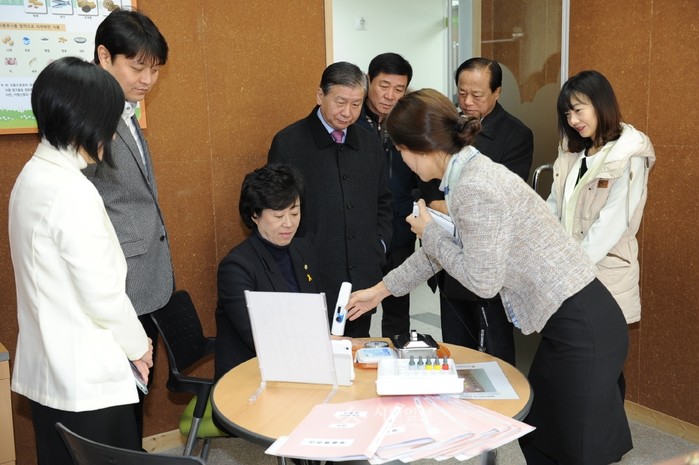 | ▲ (왼쪽 두번째부터)조석환·백정선·홍종수·유재광·심상호 의원이 아토피치유센터를 방문해 부센터장이 백정선 의원에게 아토피 피부염 환자에 대한 질환 상태를 파악하는 '경피수분 증발량 측정기계'의 시연모습을 살펴보고 있다. (사진제공=수원시의회) | ||