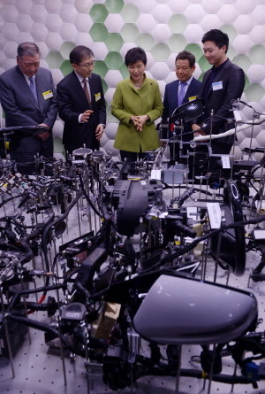 박근혜 대통령이 27일 오전 광주과기술원에서 열린 '광주 창조경제혁신센터 출범식'에 참석해 윤장현 광주광역시장, 정몽구 현대차그룹회장과 함께 센터를 시찰하고 있다.