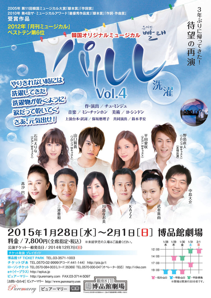 이번 일본 공연에서는 2012년 초연 멤버로, 지난해 한국에서 빨래 무대에 올랐던 노지마 나오토가 다시 무대에 오른다. 극단 사계 출신의 노지마 나오토는 <레미제라블>을 비롯, 한일 배우들이 함께 참여한 글로벌 뮤지컬 <온 에어>에도 출연한 바 있다. 또한 일본 드라마 <메이의 집사> 등에 출연한 야마구치 켄지가 이번 시즌 새롭게 솔롱고로 합류한다.