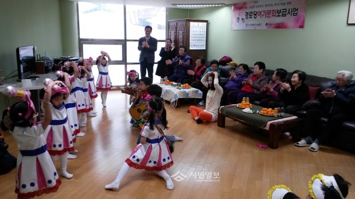최근 인천 남동구 논현2동의 브레인 어린이집·유치원 원아 30명이 '경로당과 단체 및 어린이집 자매결연' 사업의 일환으로 한화어진마을 경로당을 방문해 그동안 연습해 온 노래와 율동을 선보이는 재롱잔치를 열었다. 사진은 율동을 선보이는 어린이들의 모습. (사진제공=남동구청)