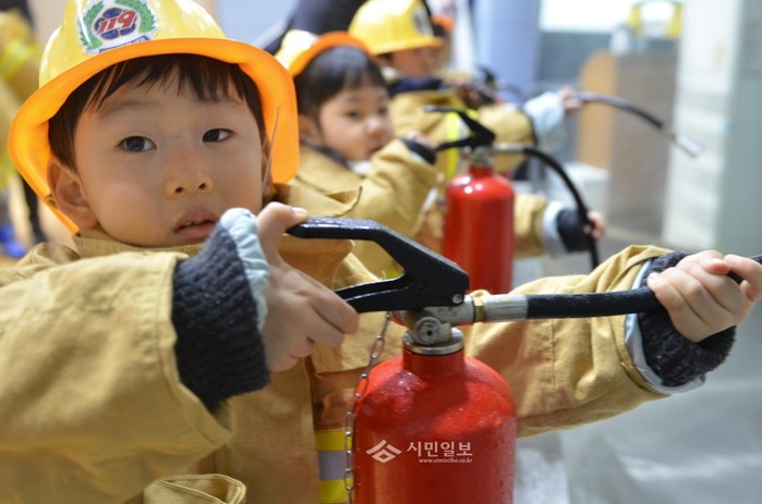 서울 종로소방서가 29일 서울 종로구 본서에서 옥인어린이집 원생들을 대상으로 소방안전교육을 실시한 가운데 어린이들이 소화기체험을 하고 있다. 2015.01.29. (사진=종로소방서 제공)