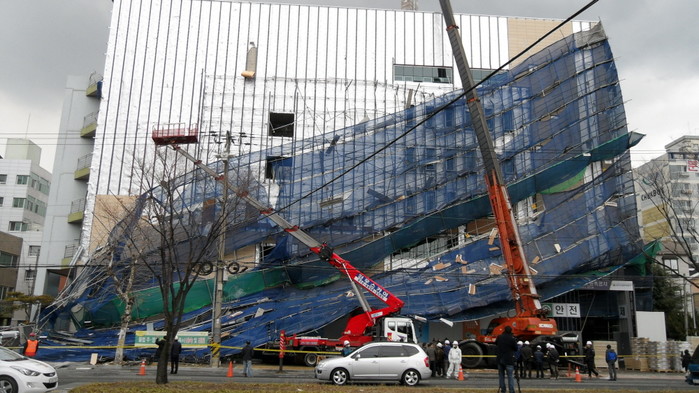 29일 오전 10시50분쯤 경북 포항시 남구 대도동 세명기독병원 증축공사현장에서 외벽 가설구조물(비계)이 무너져 근로자(현장인부) 3명이 부상을 당한 사고가 발생했다. 사진은 무너진 외벽 가설구조물의 모습.