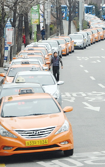 택시기사가 승차거부를 하다 2년 안에 3차례 적발되면 택시운수종사자 자격이 취소되는 ‘택시운송사업의 발전에 관한 법률’이 시행된 첫날인 29일 오전 많은 택시들이 서울역 근처에서 탑승객을 기다리며 길게 줄지어 서 있다.