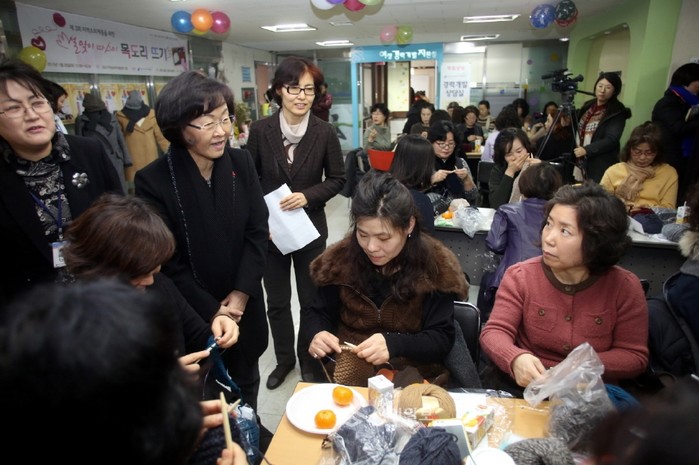 최근 서울 강남구 논현2문화센터에서 '소외계층을 위한 목도리 뜨기' 행사가 열렸다. 이날 행사를 통해 완성된 '따스미 목도리'는 추위에 약한 노인들에게 전달될 예정이다. 사진은 신연희 구청장이 손뜨개 중인 여성능력개발센터 회원들을 격려하고 있는 모습. (사진제공=강남구청)