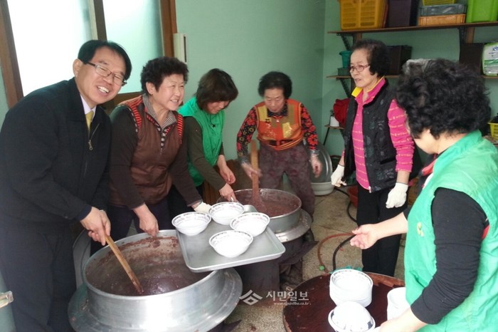 인천 강화읍 대산1리 새마을부녀회에서 최근 마을 노인들을 모시고 '팥죽 나누기 행사'를 실시했다. 부녀회는 마을주민이 직접 재배한 재료를 구입해 직접 팥죽을 쑤어 노인들에게 제공했다. 사진은 부녀회 회원들이 팥죽을 쑤고 있는 모습. (사진제공=강화군청)
