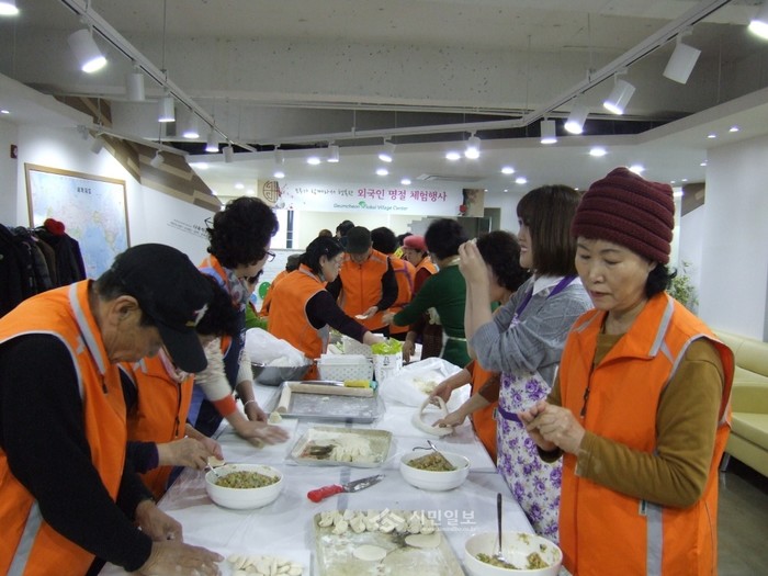 최근 서울 금천구가 금천글로벌빌리지 센터에서 금천구에 거주하는 외국인, 결혼이민자, 주민 등 50여명이 참여한 가운데 외국인의 지역사회 정착을 돕기 위한 '설맞이 만두빚기 및 한복입기 체험행사'를 열었다. 사진은 만두를 빚는 참여자들의 모습.(사진제공=금천구청)