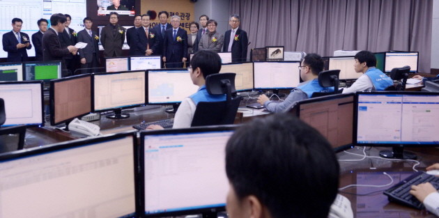 30일 오전 서울 KT광화문 빌딩에서 열린 문화체육관광 사이버안전센터 청사 이전 개관 현판식에 김종덕 문화체육관광부 장관을 비롯한 참석자들이 상황실을 둘러보고 있다.