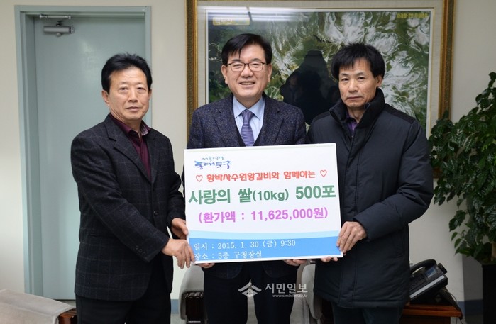 최근 서울 동대문구 용신동에서 수원왕갈비집을 운영하는 황기연 대표가 어려운 이웃을 위한 사랑의 쌀 10kg 500포(1160만원 상당)를 기부했다. 쌀은 지역내 홀몸노인 등 취약가구에게 전달될 예정이다. 사진은 유덕열 구청장(가운데)과 황기연 대표(오른쪽)가 전달식에서 기념촬영한 모습. (사진제공=동대문구청)