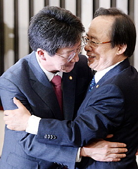 2일 오전 서울 여의도 국회에서 새누리당 ‘2015년 원내대표 및 정책위의장 선출’ 의원총회가 열린 가운데 유승민 의원과 원유철 의원이 각각 원내대표와 정책위의장에 선출, 유승민 의원(왼쪽)과 이주영 의원이 포옹을 하고 있다.