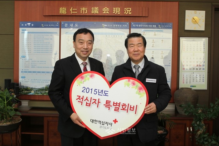 2일 오후 신현수 경기 용인시의회 의장이 집무실에서 김훈동 대한적십자사 경기도지사 회장에게 적십자특별회비를 전달했다. 이 자리에서 신 의장은 어려운 이웃을 돕는 적십자사에 감사를 표하고 적십자회비가 우리 주변의 어려움을 겪는 이웃을 돕는 인도주의 활동에 소중히 쓰이길 바란다고 전했다. 사진은 신 의장(왼쪽)과 김 회장(오른쪽)의 모습.(사진제공=용인시의회)