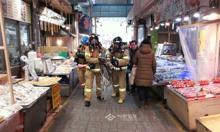 3일 오전 인천 남부소방서가 남구 주안7동의 신기시장에서 시장 상인들의 화재대응 능력을 키우고 지휘체계를 확립하기 위한 '민·관합동 소방훈련'을 실시했다. 사진은 훈련에 참여한 소방관들이 실전처럼 장비를 갖춘 채 소화장비를 전개 중인 모습.(사진제공=남부소방서)
