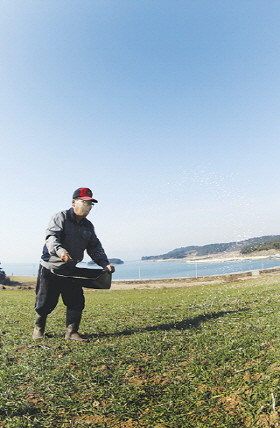 입춘(立春)을 하루 앞둔 3일 오전 전남 강진군 마량면 수인마을 보리밭을 찾은 농부가 보리의 생장에 도움을 주는 웃거름을 뿌리며 봄을 반기고 있다.