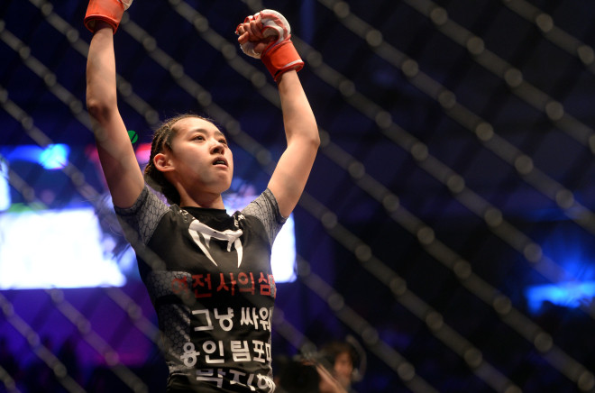 | ▲ 박지혜(25, 팀포마)가 1일 오후 서울 중구 장충체육관에서 열린 '굽네치킨 로드FC 021' 여성부 아톰급 매치에서 이리메 미유(21, 일본)를 상대로 2라운드 TKO 승을 거뒀다. 박지혜 선수가 세리모니를 하고 있다. / 뉴시스 | ||