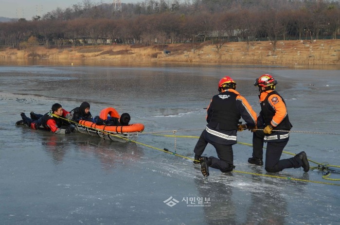 인천 남동소방서구조대가 지난 3일 인천대공원 호수에서 '2015 동계수난 구조훈련'을 실시했다. 훈련은 겨울철 수난사고 발생시 신속한 피해자 구조 및 응급처치를 위해 구조기술 숙련, 장비사용 능력 연마 등으로 구성됐다. 사진은 구조대원들이 수난사고 구조훈련을 하고 있는 모습. (사진제공=남동소방서)