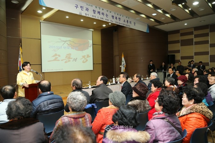 지난 3일 서울 서초구 반포1동주민센터에서 열린 ‘구민과 함께하는 행복한 소통의 장’에 참여한 조은희 구청장이 주민들의 민원사항을 접수하는 등 주민과의 소통의 시간을 가지고 있다. (사진제공=서초구청)