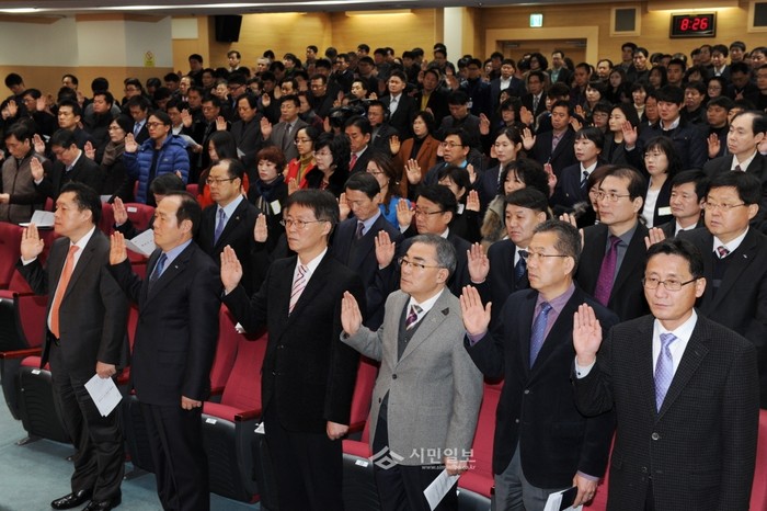 4일 수원시청 대강당에서 열린 ‘청렴행정 실쳔 결의 선서식’에 참여한 시청 공무원들이 오른손을 들고 친절, 공정, 청렴행정을 실천하기로 결의를 하고 있다.(사진제공=수원시청)