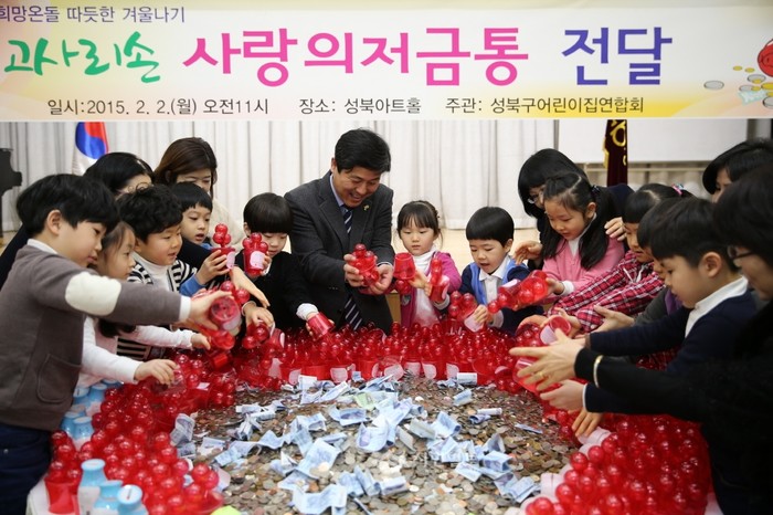 지난 2일 서울 성북구 어린이집 연합회는 3개월 동안 아이들이 한푼 두푼 모은 사랑의 저금통을 전달하는 '고사리손 사랑의 저금통 전달식'을 개최했다. 사진은 그동안 저금통에 열심히 모은 동전을 쏟아붓고 있는 아이들과 김영배 성북구청장(가운데)의 모습. (사진제공=성북구청)