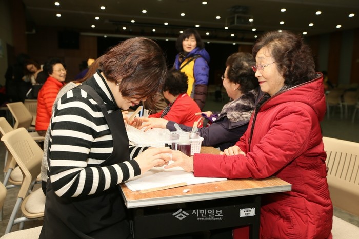5일 오후 서울 금천구는 사진쟁이 아이리스, 엠뷰티 아카데미, 금천새바람봉사단 봉사자들과 함께 구청 대강당에서 저소득층 홀몸노인 70여명을 대상으로 여생을 건강하게 지내길 바라는 의미의 장수 사진 촬영행사를 열었다. 사진은 장수 사진을 촬영 중인 참여자들의 모습.(사진제공=금천구청)
