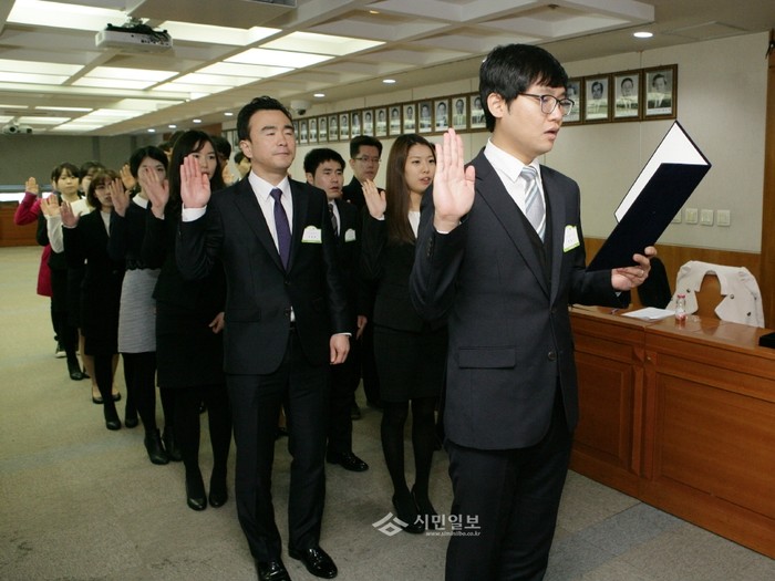 지난 2일 서울 성동구 새내기 공무원 21명이 구청에서 신고식을 했다. 신규 임용 첫날을 맞은 공무원들은 신고식에서 공무원 선서를 낭독하고 임용장을 받았다. 사진은 성동구 신규 직원들이 공무원 선서를 낭독하고 있는 모습. (사진제공=성동구청)