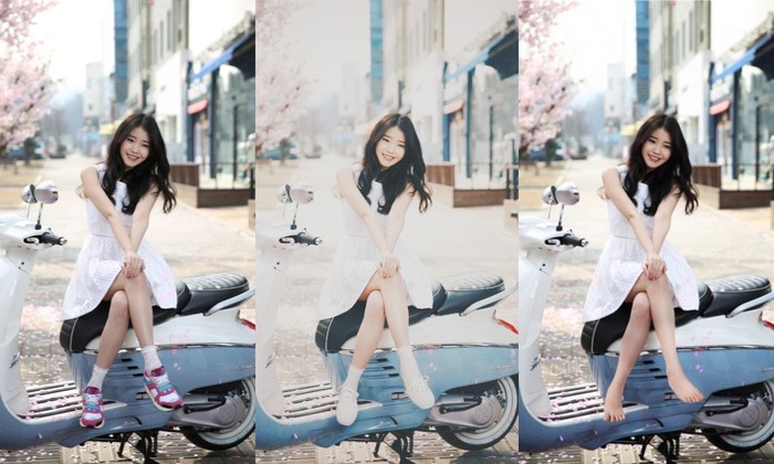 | ▲ 왼쪽부터 스베누 아이유 광고 스틸컷 원본, 흰색 운동화 버전, 맨발 버전 | ||