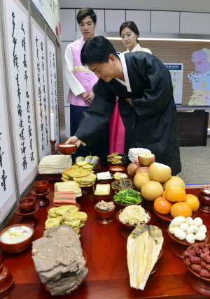 6일 오전 서울 서초구 양재동 at센터에서 한국농수산식품유통공사 임직원들이 설날 차례상 차리기를 시연해 보이고 있다.