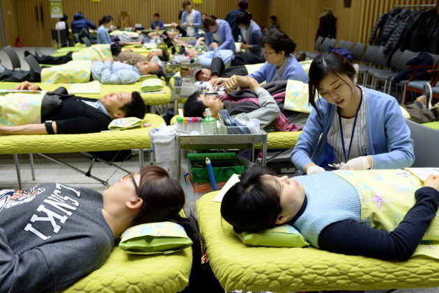 서울시가 6일 오전 서울시청에서 사랑의 헌혈 행사를 연 가운데 공무원들이 헌혈을 하고 있다. 이번 헌혈로 받은 증서는 장기간 치료와 수혈이 필요한 소아암 환자에게 전달된다.