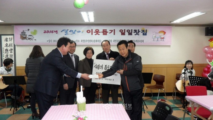지난 6일 경기 부천시 소사구 괴안동 주민자치위원회가 괴안동 주민센터에서 '설맞이 일일찻집'을 열고 서예작품 전시, 오카리나 공연 등을 진행했다. 또한 이 자리에서 MG남부천 새마을금고는 '사랑의 좀도리 운동'의 일환으로 온누리상품권 100만원을 후원했다. 사진은 후원금을 전달하는 관계자들의 모습.(사진제공=부천시청)