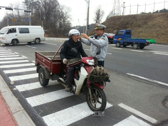 9일 경기 용인동부경찰서 교통관리계는 이륜차를 운전하는 노인들의 교통안전을 위해 직접 안전모를 배부했다. 이와함께 신호준수, 무단횡단, 이륜차 인도주행 금지와 같은 안전운행에 대해서도 당부했다. 사진은 교통경찰이 한 노인에게 안전모를 씌워주고 있는 모습. (사진제공=용인동부경찰서)