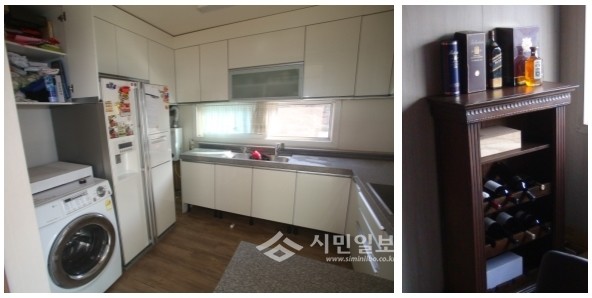 | ▲ 당초 농산물직거래 매장으로 신고됐던 구룡마을 주민자치회관이 토지주 사무실 및 주민자치회 특정간부의 주택 등으로 불법용도 변경돼 사용되고 있다. 사진은 현재 주민자치회관 주방과 거실에 양주ㆍ와인이 진열돼 있는 모습. | ||