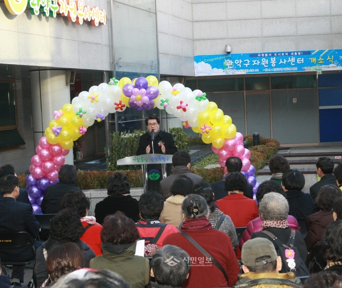 서울 관악구가 최근 구청 지하 1층 광장에서 주민들과 함께 ‘관악구자원봉사센터 개소식’을 연 가운데 유종필 관악구청장이 행사에 참석해 주민들에게 민관이 함께 손 잡고 자원봉사센터를 통해 복지도시를 만들어 나갈 것임을 밝히고 있다. (사진제공=관악구청)