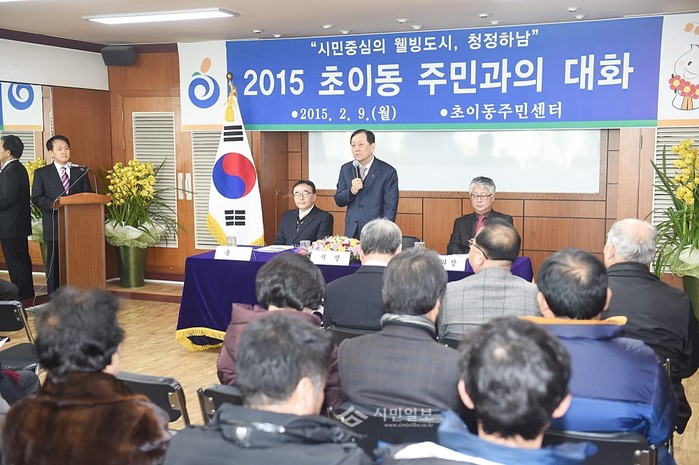 9일 경기 하남시 초이동 주민센터에서 주민과의 대화가 열렸다. 연초 주민과의 대화 중 마지막 일정인 이날은 100여명의 주민들이 참여해 도로 신설, 보행로 설치, 버스노선 신설 등의 의견을 이교범 하남시장에게 전달했다. 사진은 발언 중인 이 시장의 모습.(사진제공=하남시청)