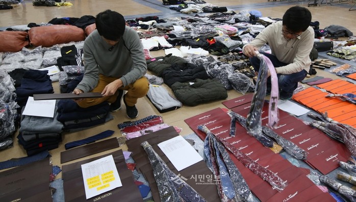| ▲ 서울 중구 단속반이 지난해 실시한 위조상품 단속으로 압수한 물품들을 살펴보고 있다. (사진제공=중구청) | ||