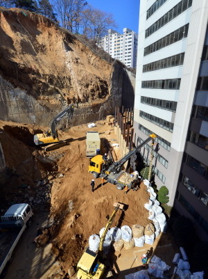 지난 9일 오후 광주 남구 봉선동 대화아파트에서 '옹벽 붕괴사고 민관 합동대책본부'가 흘러내리는 토사를 막기 위해 중장비를 동원해 아파트와 사고현장 사이에 10m 높이의 방호벽을 설치하고 있다.