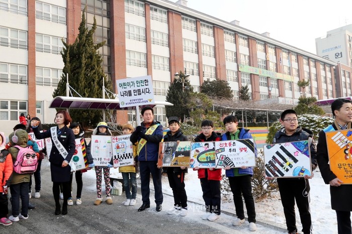 10일 오전 정찬민 용인시장은 경기 용인시 기흥구 구갈로36에 위치한 구갈초등학교에서 녹색어머니회, 모범운전자회, 경찰, 학생 등 50여명이 참여한 가운데 진행된 '녹색어머니회 교통안전캠페인'에 참여해 교통안전을 위한 홍보활동을 실시했다. 사진은 정 시장(가운데)과 학생들이 홍보활동 중인 모습.(사진제공=용인시청)