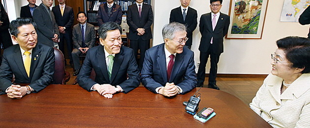 새정치민주연합 문재인 당대표와 지도부가 11일 오전 서울 동교동 김대중도서관에서 이희호 여사를 예방하고 있다.