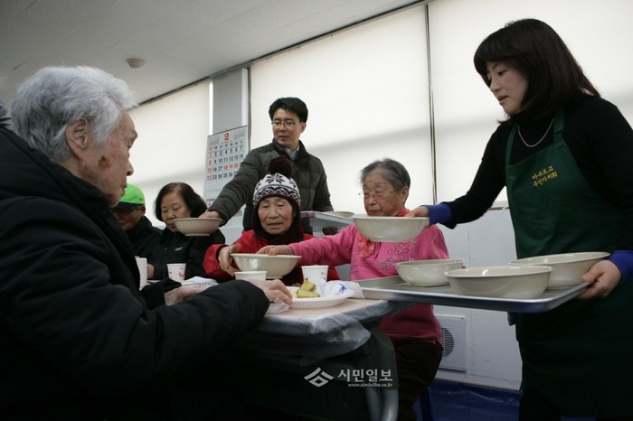 서울 성동구(구청장 정원오) 마장동 새마을부녀회가 지난 10일 설을 앞두고 지역내 홀몸노인 및 저소득 취약계층 등 200여 가구를 대상으로 '사랑의 떡국 나눔 행사'를 개최했다. 사진은 새마을부녀회 회원들이 사랑의 떡국 나눔 행사에 모인 노인들에게 떡국을 나눠주고 있는 모습. (사진제공=성동구청)