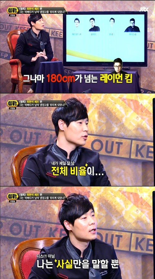 또한 레이먼킴 셰프의 키가 180cm이 넘는다는 MC들의 말에는 “레이먼 셰프는 저도 친한데 키는 크지만 비율이 좋지 않다. 이건 그냥 있는 그대로의 사실을 말씀드리는 거다”고 말해 다시 한 번 모두를 폭소케 하고 말았다.