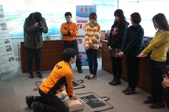 인천 서부소방서가 12일 오후 3~5시 인천항만공사 대학생 블로그 기자단을 초청해 소방안전교육 특별 이벤트를 실시했다. 총 9명의 기자단이 서부소방서를 방문해 심폐소생술 체험 등 소방안전교육을 시작으로 소방차 및 소방장비 견학, 정서진119구조대 견학 등을 진행했다. 사진은 한 소방대원이 기자단에게 심폐소생술 교육을 하고 있는 모습. (사진제공=서부소방서)